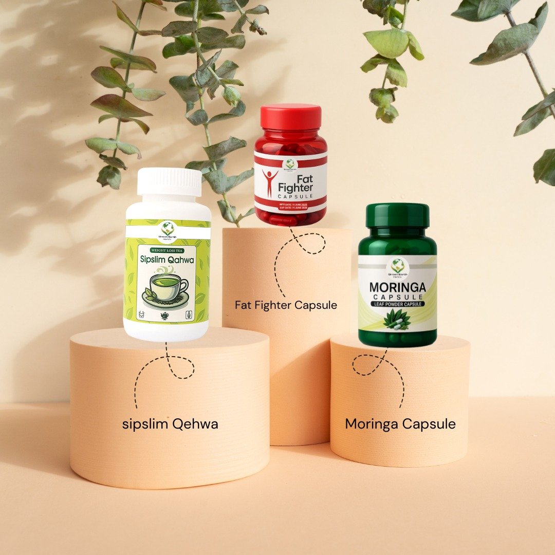 The Total Wellness Combo from Green Earth Herb® combines the power of Fat Fighter Capsules, Sipslim Qahwa, and Moringa Capsules — a perfect trio for total body wellness, energy, and weight management.